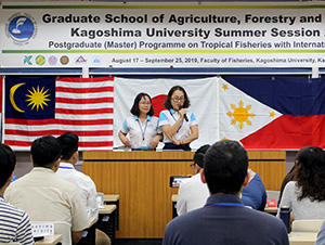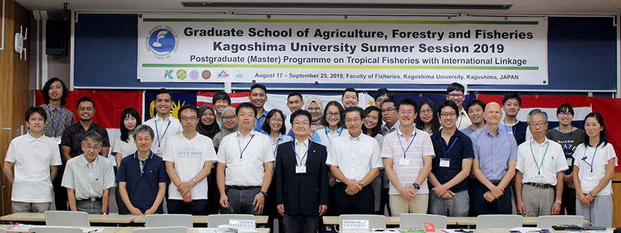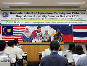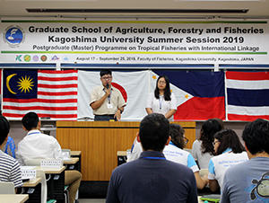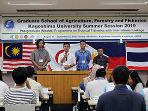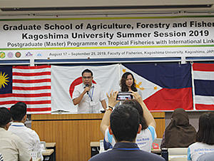 On 19th August, 2019, the opening ceremony of Summer Session for the Graduate School of Agriculture, Forestry and Fisheries 2019 was held at Faculty of Fisheries, Kagoshima University, Kagoshima. The summer session is offered for the master course students registered for the “Postgraduate (Master) Program on Tropical Fisheries with International Linkage (ILP)”, which is an international alliance to share the curriculum formed with characteristic subjects provided by the member schools in Southeast Asian countries and Japan.