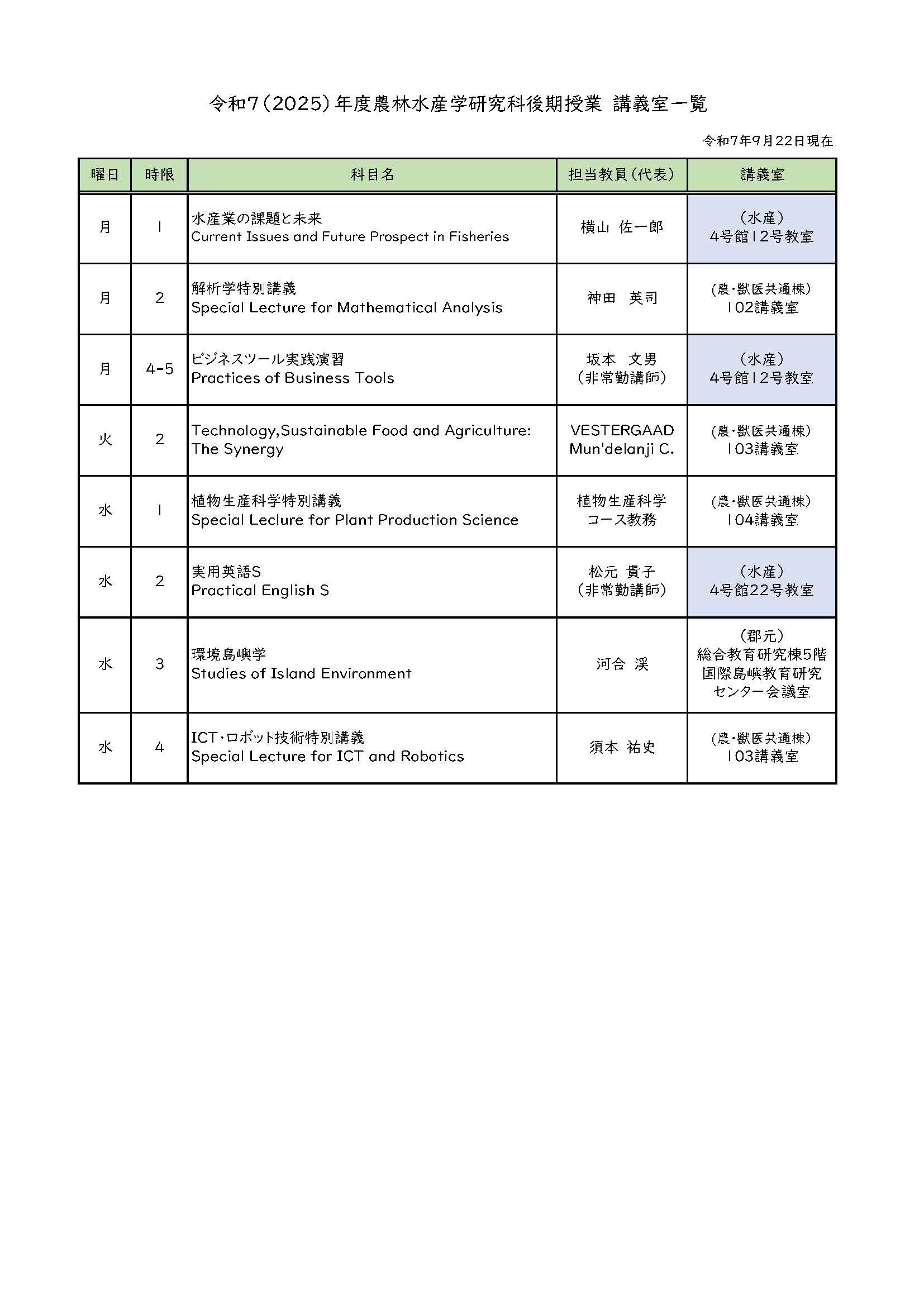令和7年度後期 使用講義室 [公開日:2025/09/22(最新版)]