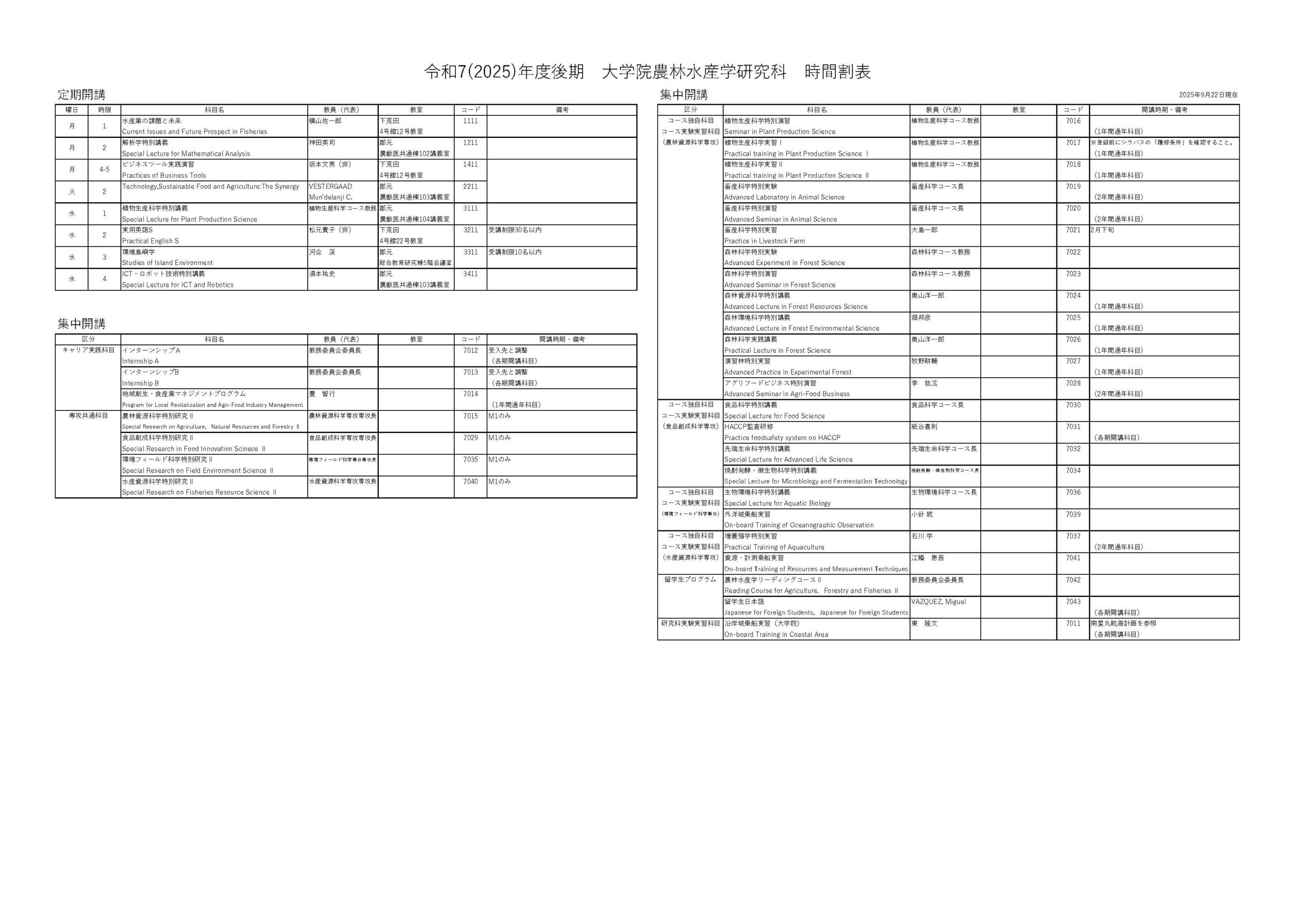 2025年度 後期時間割表 [更新日:2025/09/22(最新版)]