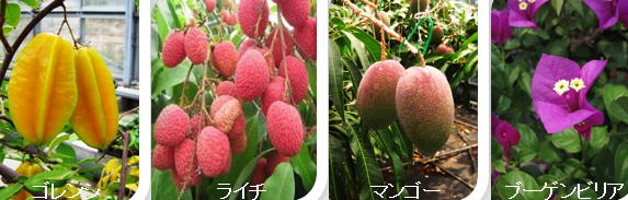 | 果樹類 | マンゴー、アセロラ、シロサポテ、レイシ、リュウガン、ゴレンシ、グアバ、レンブ、インドナツメ、トケイソウ属、レンブ、ジャボチカバ 、アボカド |